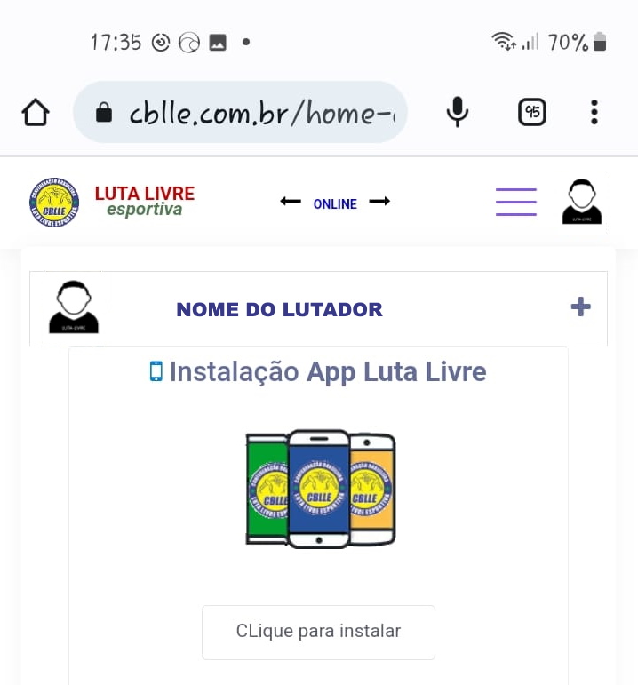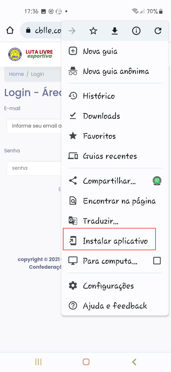 Outra alternativa para forçar o aparecimento dessa opção para ativar a instalação (em qualquer página da Área do Lutador) é usar o menu do navegador (3 pontinhos no canto superior do navegador).